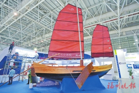 昨日上午,记者走进海峡国际会展中心3号馆,一艘将近8米长的中式帆船实体船傲立场馆中央,引人注目。它是世界上第一艘通过国际认证的木质中式运动帆船——“乐舫”。