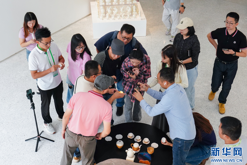 11月14日,媒体人士和网络大V在龙鹏艺术馆了解陶瓷茶具特色。新华网 肖和勇 摄