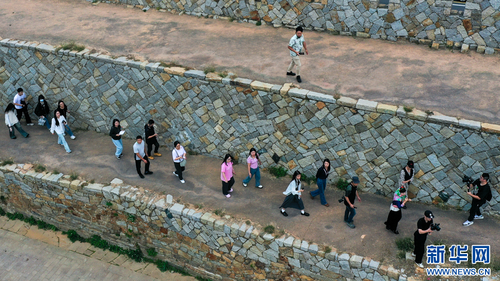 11月14日,媒体人士和网络大V在崇武古城的古城墙上徜徉(无人机照片)。新华网 肖和勇 摄