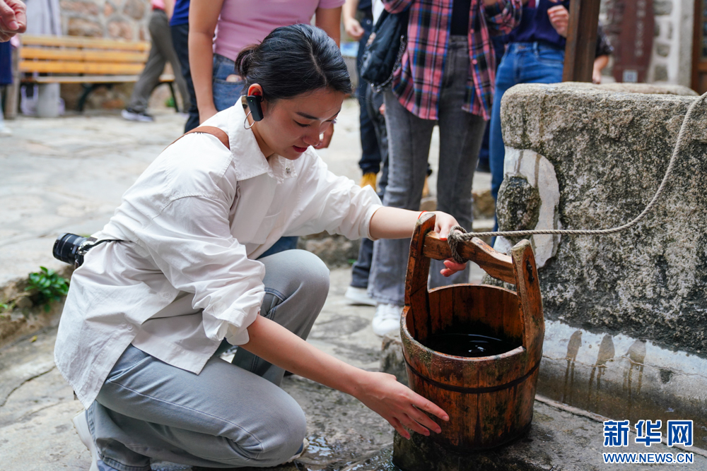 11月14日,媒体人士在崇武古城染丝井打水,感受别样清凉。新华网 肖和勇 摄