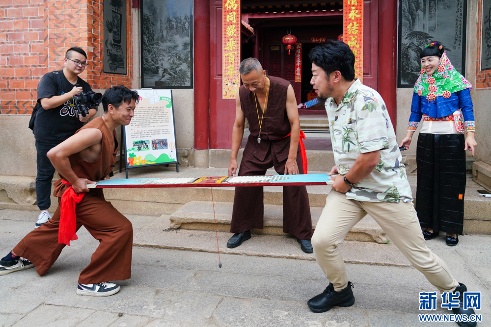 11月14日,网络大V与渔民角力,感受当地特色民俗活动。新华网 肖和勇 摄