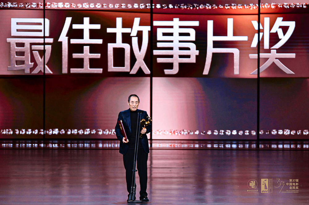 著名导演张艺谋上台领奖并致辞,其作品《第二十条》获本届金鸡最佳故事片奖。新华网发(主办方供图)