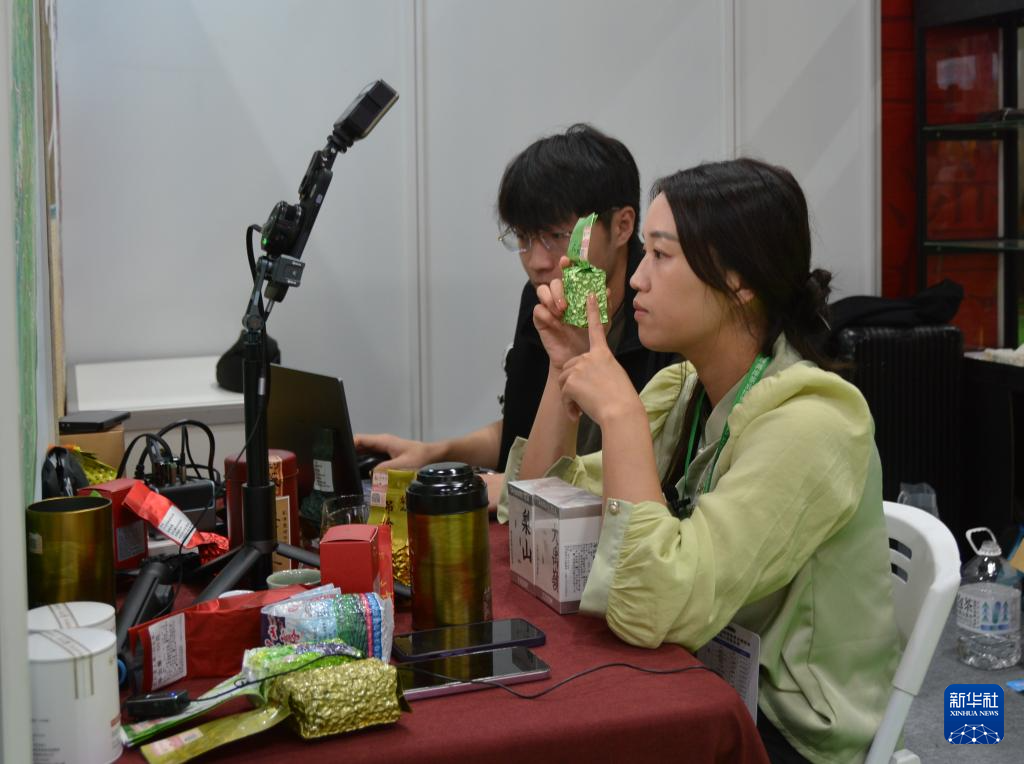 11月16日,在第十六届海峡两岸茶博会现场,参展商直播卖货。新华社记者 张华迎 摄