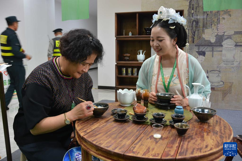 11月16日,在第十六届海峡两岸茶博会现场,一位观众体验宋式点茶技艺。新华社记者 张华迎 摄