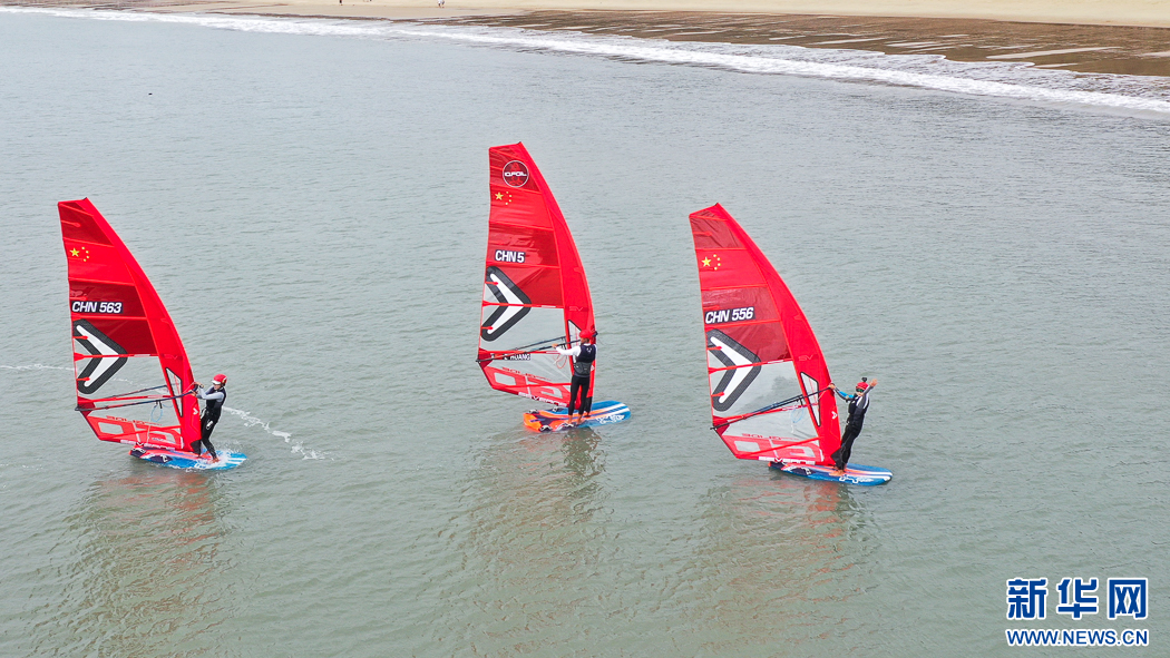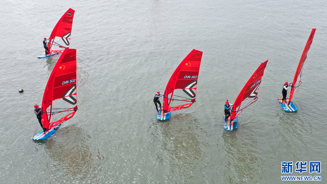 帆板运动员在海上扬帆训练(无人机照片)。新华网 肖和勇 摄