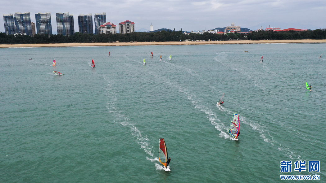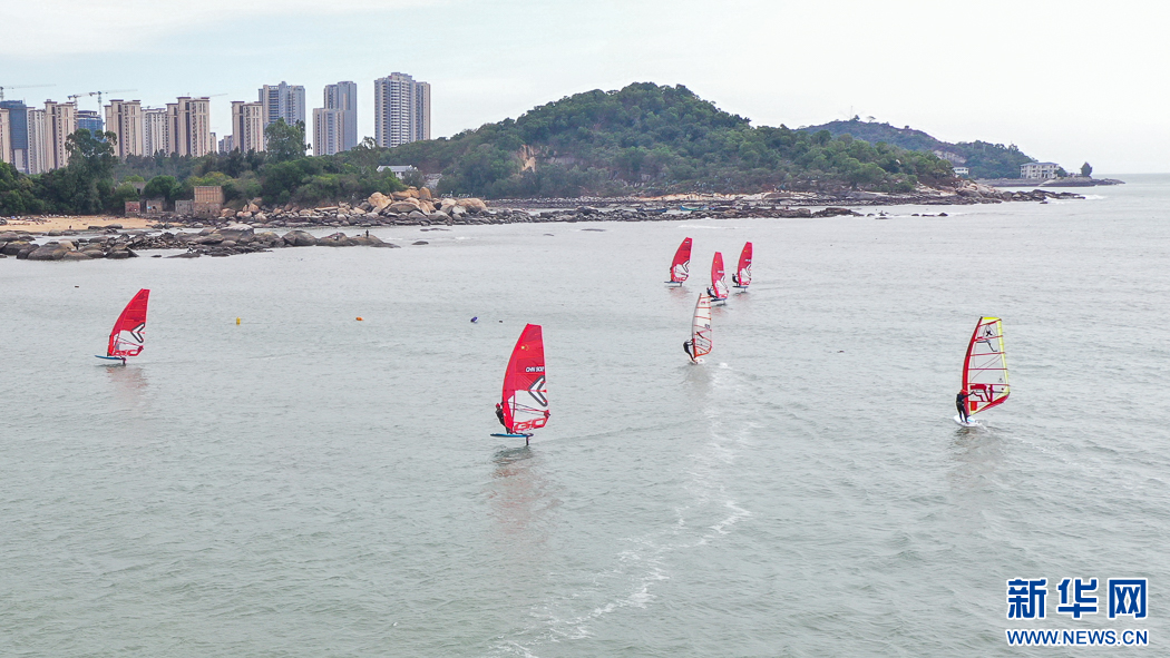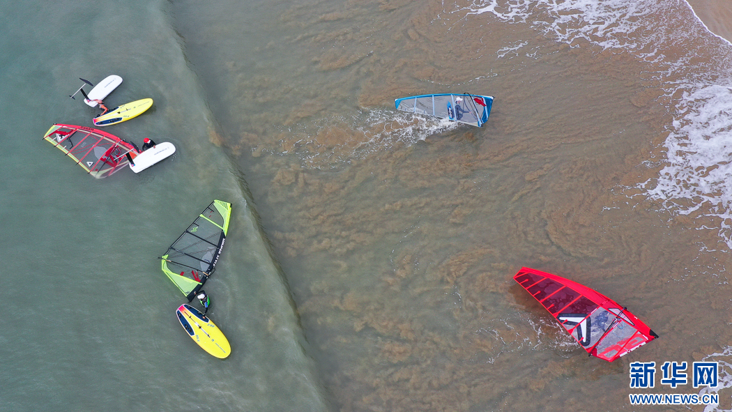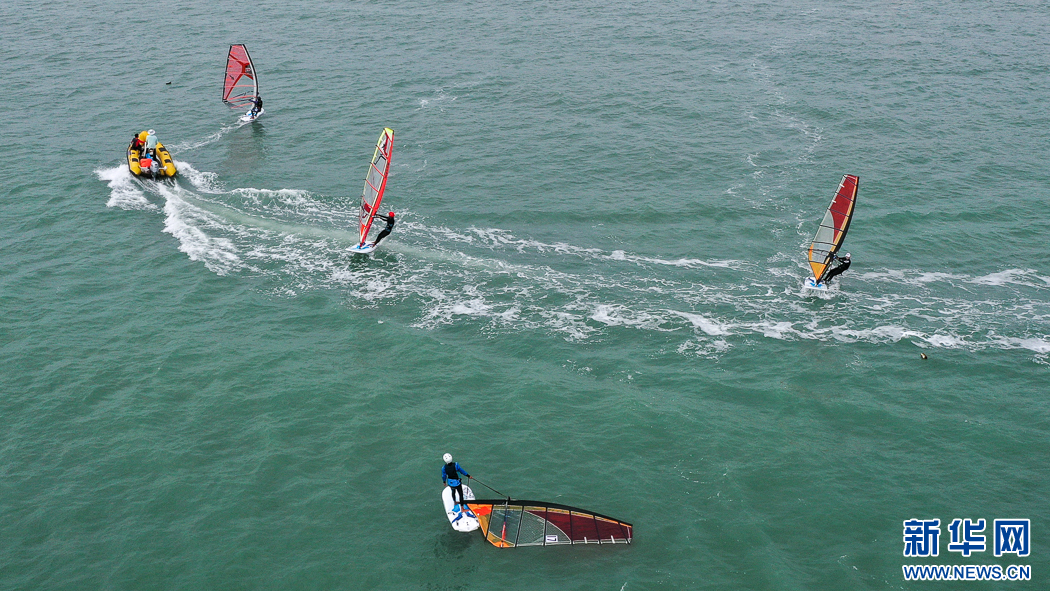 帆板运动员在海上竞速(无人机照片)。新华网 肖和勇 摄