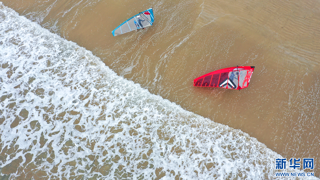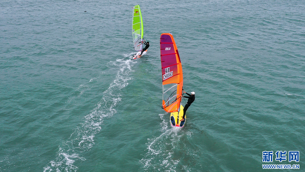 帆板运动员在海上训练(无人机照片)。新华网 肖和勇 摄