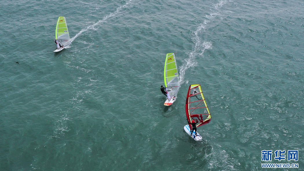 帆板运动员在海上扬帆竞速(无人机照片)。新华网 肖和勇 摄