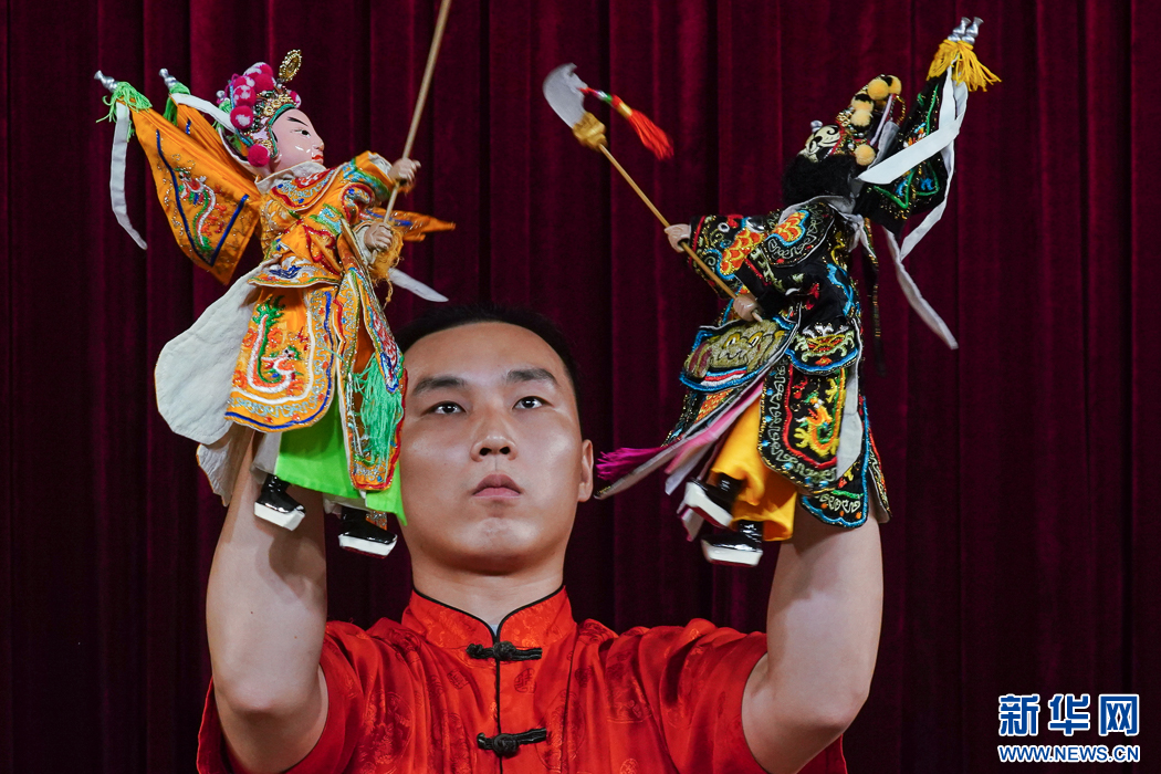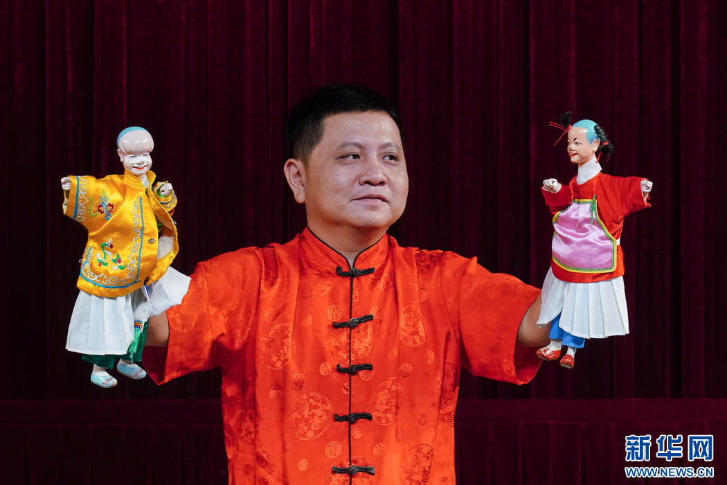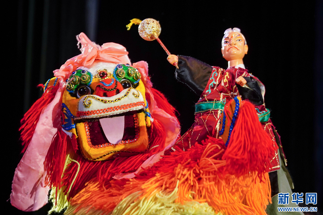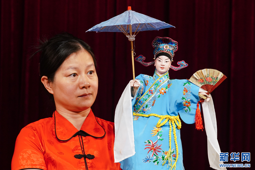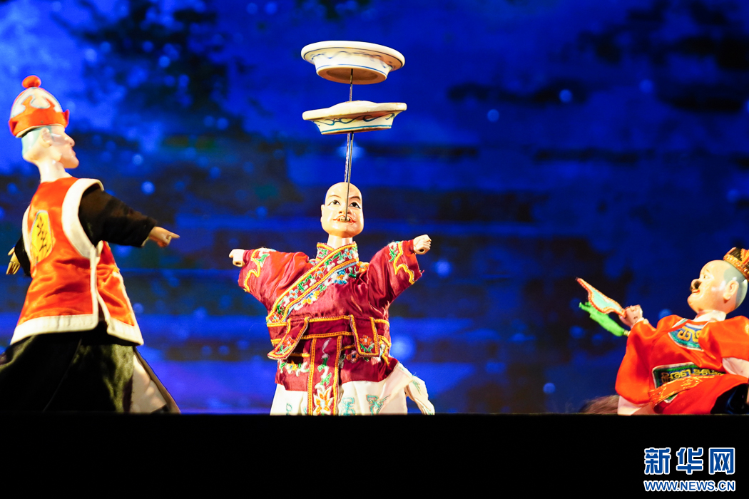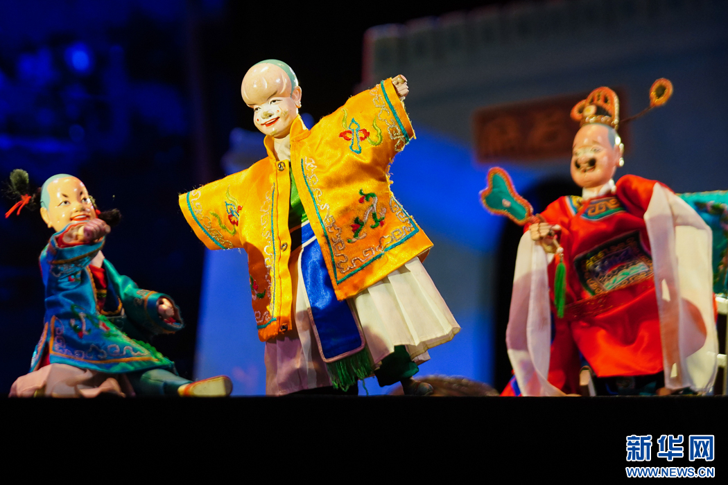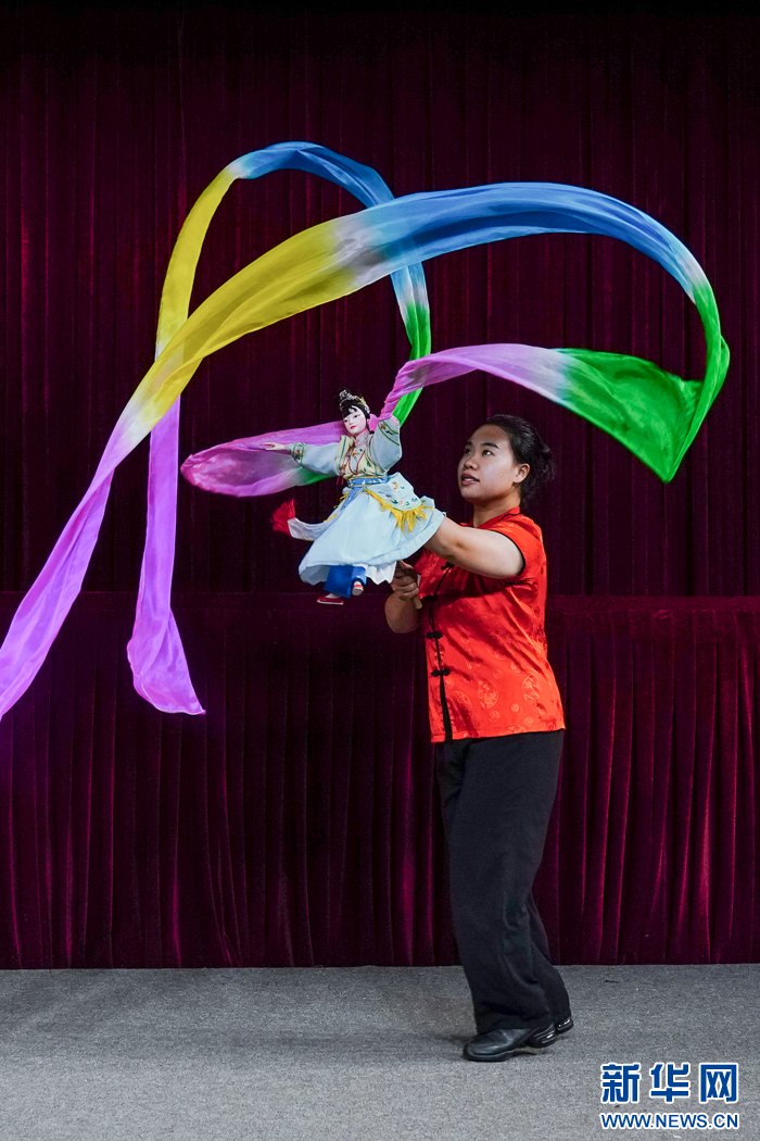 这是互动节目《指掌乾坤》,漳州市布袋木偶戏传承保护中心演员在演示花旦舞彩绸场景。新华网 肖和勇 摄