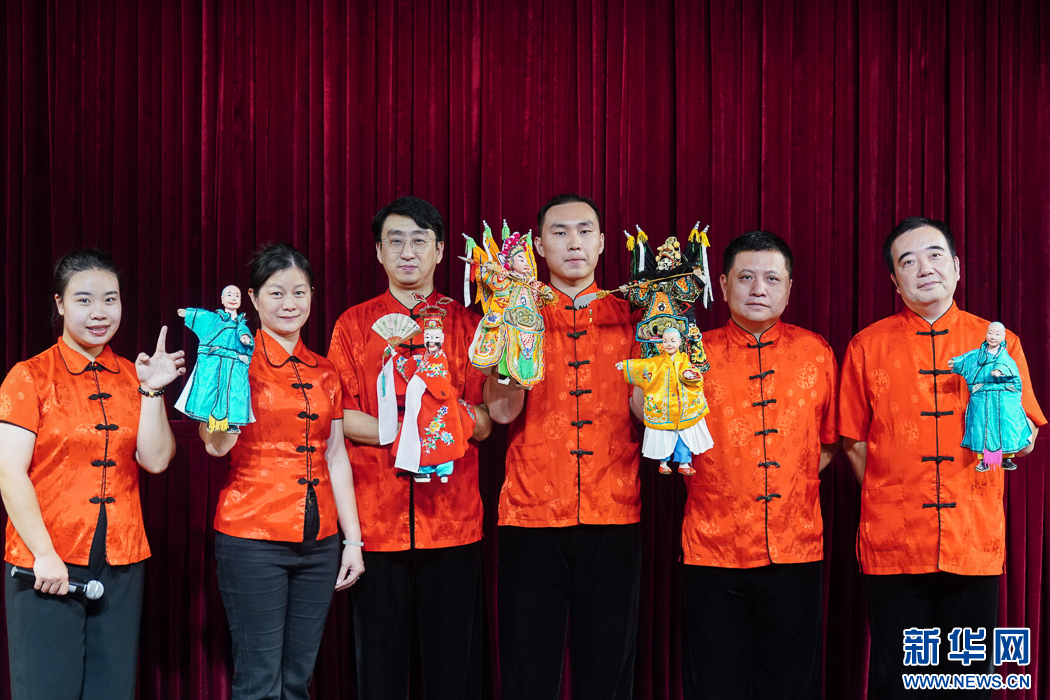 漳州市布袋木偶戏传承保护中心演员带着各自的角色行当,走到台前与观众“偶”遇,人偶同台表演《指掌乾坤》。新华网 肖和勇 摄