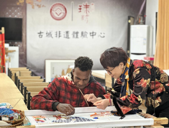非遗技艺传承人陈克忍为留学生讲解珠绣技艺
