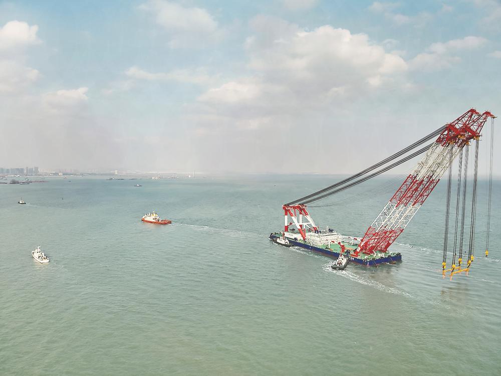 4日,在厦门海事局海巡船艇“海巡0807”“海巡08181”轮的护航下,国内最大双臂架变幅式起重船“二航卓越”轮顺利抵达厦金大桥(厦门段)工程施工水域。该轮将参与东锚碇钢沉井系梁安装、钢箱梁吊装等作业。