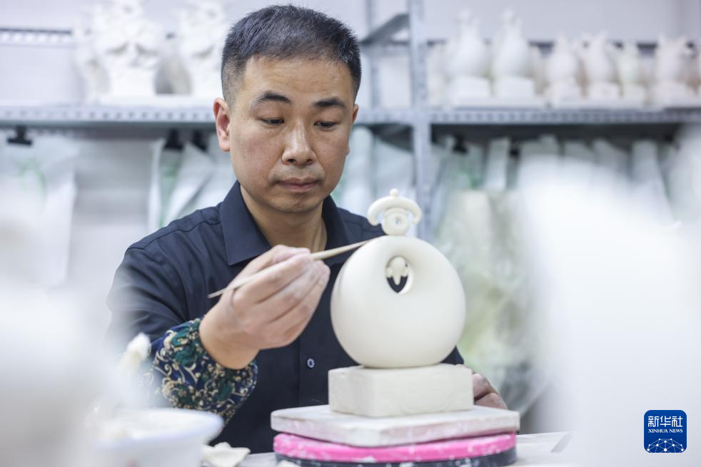 12月6日,彭成雄在位于福建省泉州市德化县的工作室内进行修坯工作。新华社记者 姜克红 摄