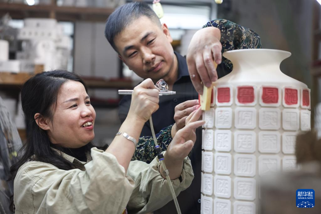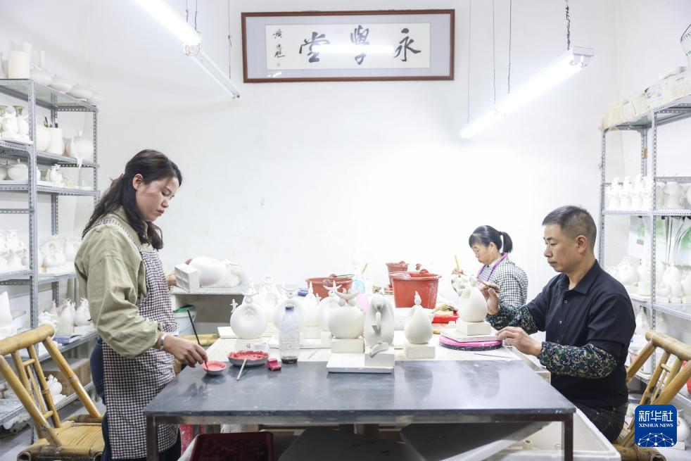 12月6日,彭成雄与妻子郑宝珠在位于福建省泉州市德化县的工作室内为陶瓷作品上色。新华社记者 姜克红 摄