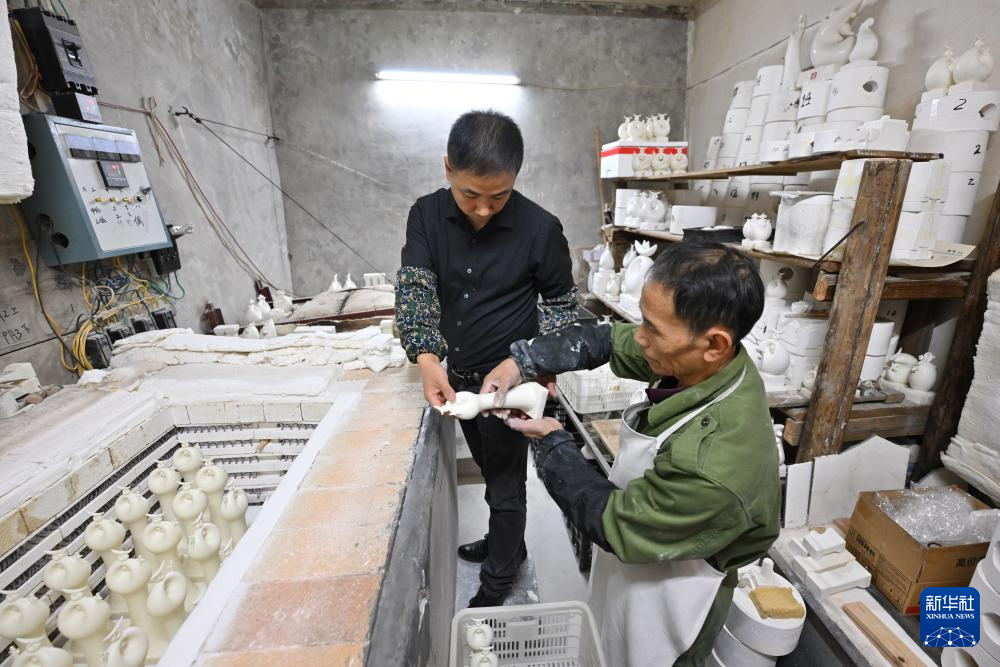 12月6日,彭成雄(左)在位于福建省泉州市德化县的工作室内与父亲一起将烧制好的陶瓷作品出炉。新华社记者 姜克红 摄