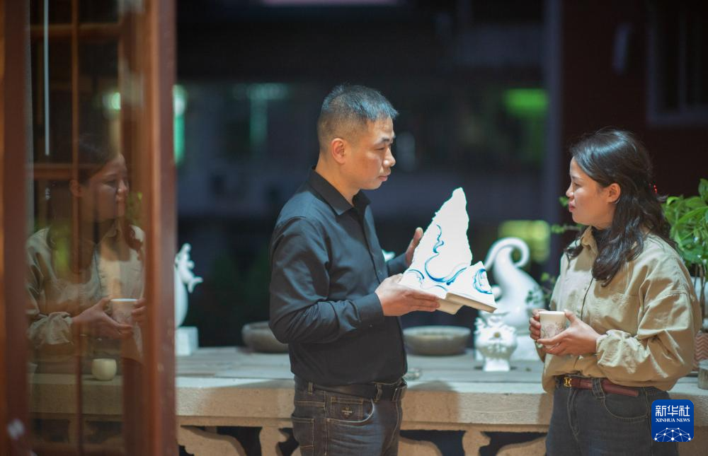 12月6日,彭成雄与妻子郑宝珠在位于福建省泉州市德化县的工作室内交流设计思路。新华社记者 姜克红 摄