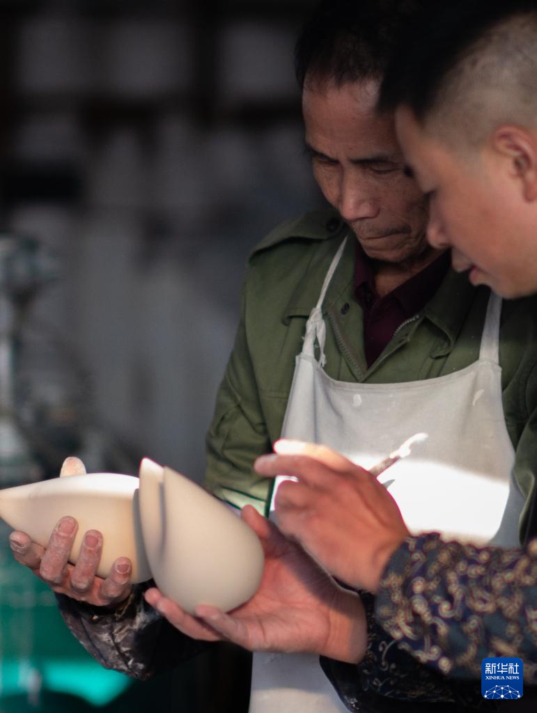 12月6日,彭成雄(右)在位于福建省泉州市德化县的工作室内与父亲一起查看陶瓷坯体。新华社记者 姜克红 摄