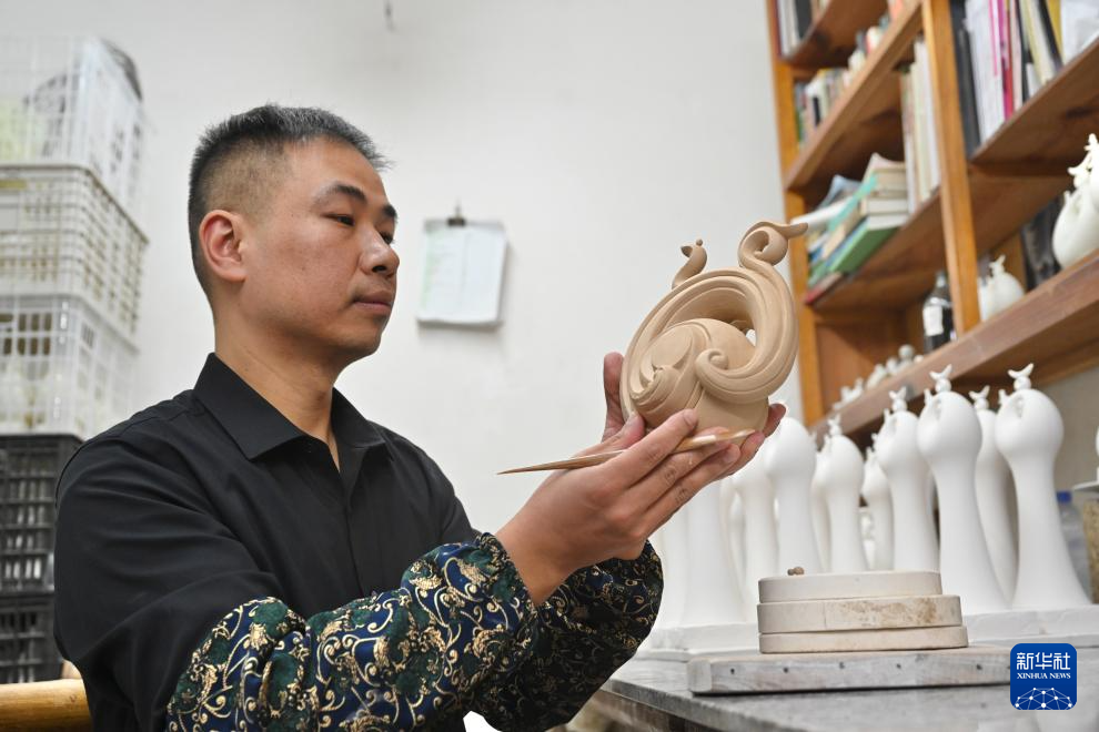 12月6日,彭成雄在位于福建省泉州市德化县的工作室内设计作品。新华社记者 姜克红 摄