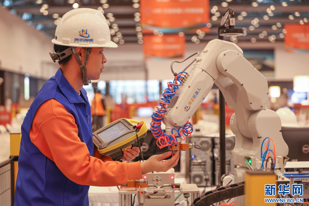 本届大赛共设66个竞赛项目,图为选手在竞技项目中调试机器人。新华网发(刘翼 摄)