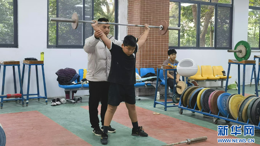 福建马江举重基地里,教练正指导小运动员训练。 新华网 刘丰 摄
