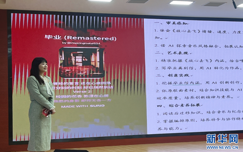 青年教师展示学生用AI创编的毕业歌曲。新华网 林晨 摄