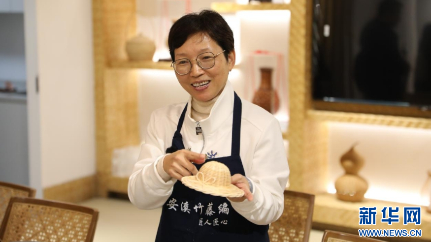 陈红萍展示现场制作的竹藤编作品。新华网发(主办方 供图)