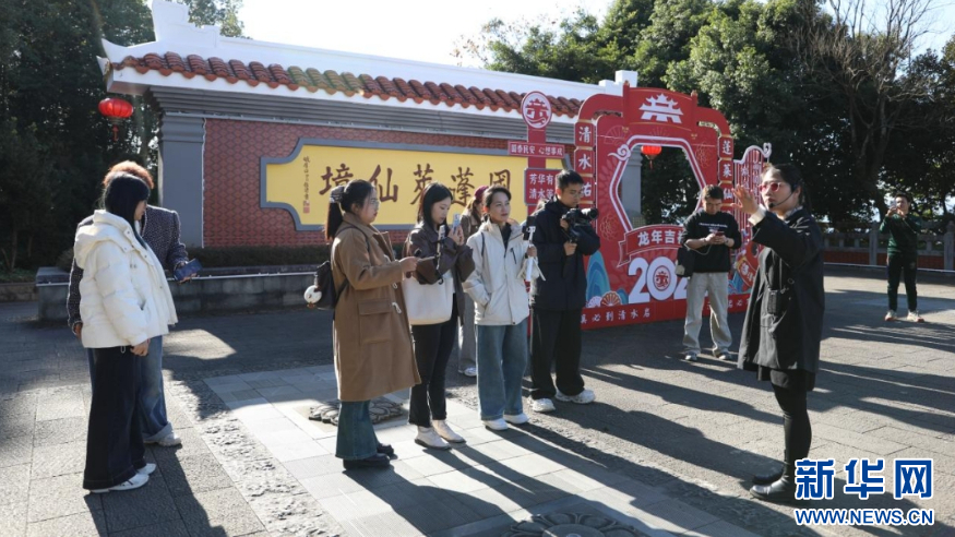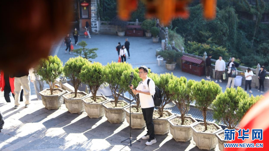 清水岩景区讲解员为主播们讲解名胜古迹。新华网发(主办方 供图)