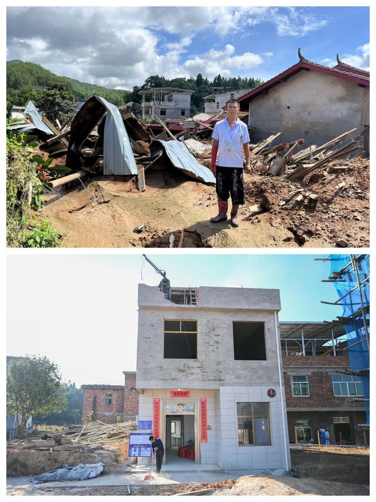 拼版照片:上图为中赤镇村民童祥恭的房屋被洪水冲毁(6月20日摄);下图为童祥恭在打扫新居(12月17日摄)。