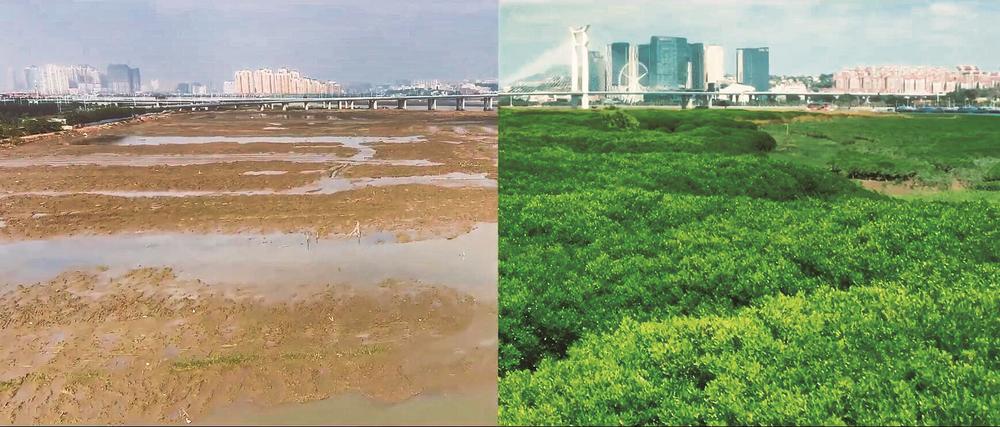 泉州湾晋江入海口红树林修复前后对比。