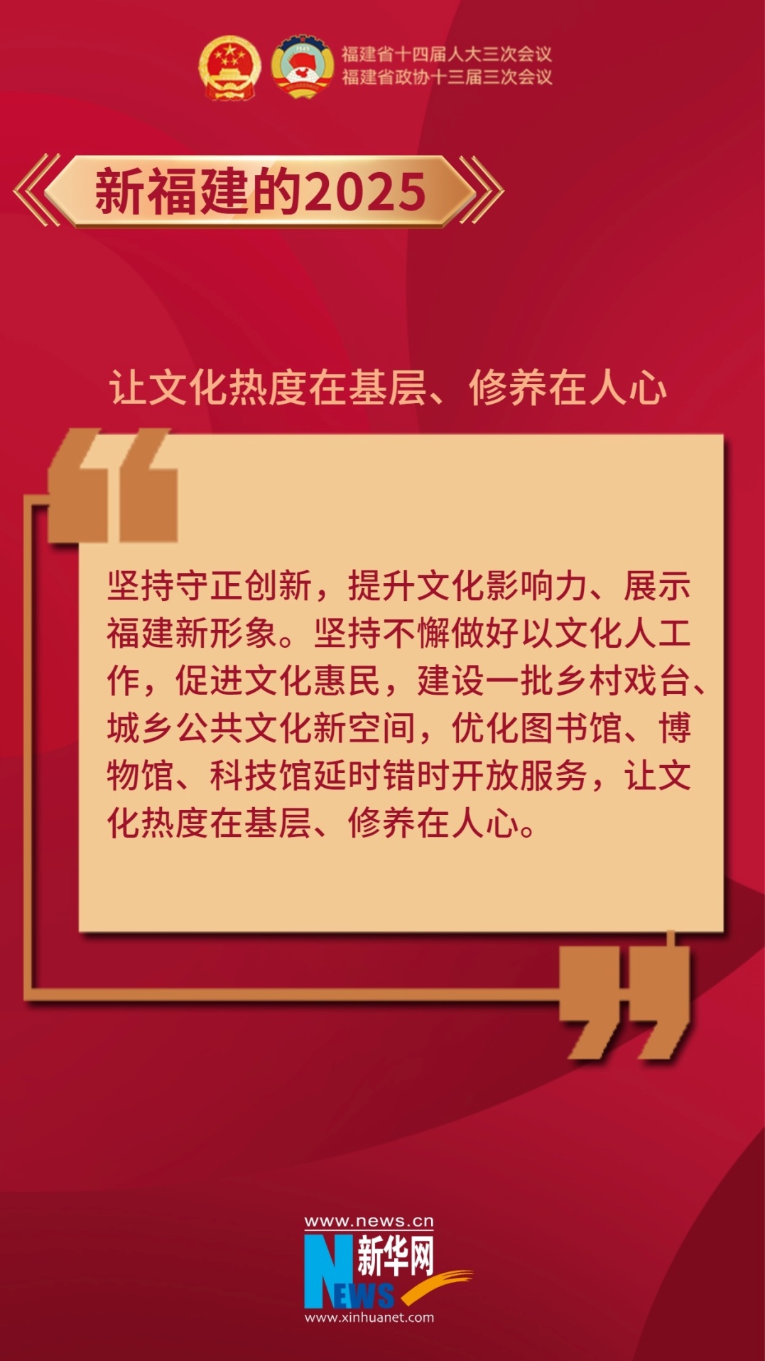 新华网福州1月14日电(刘丰 袁羽)1月13日提交福建省十四届人大三次会议审议的政府工作报告里,这些金句暖心又提气,吹响了福建2025年奋斗号角。报告指出,2025年,福建要促进文化惠民,让文化热度在基层、修养在人心。