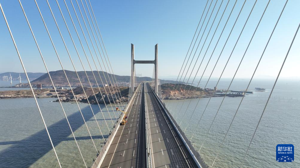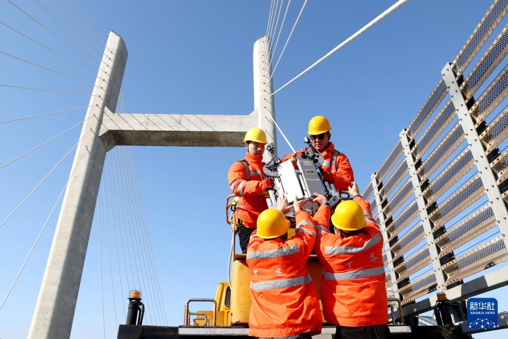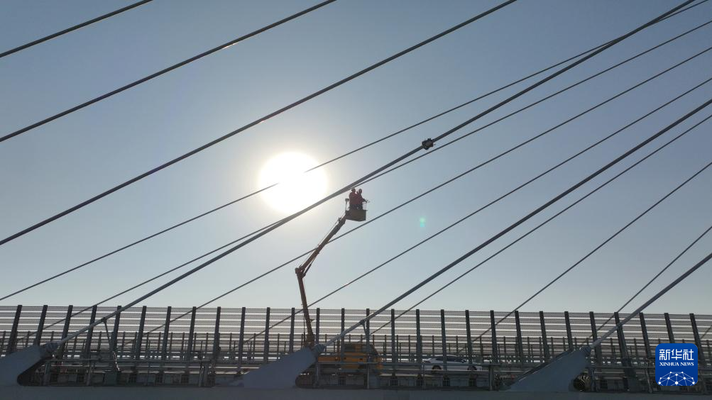 1月15日,福州工务段工人检修平潭海峡公铁大桥桥梁斜拉索(无人机照片)。新华社记者 周义 摄