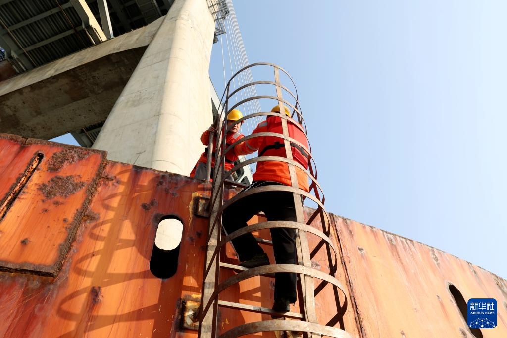 1月15日,福州工务段工人爬上平潭海峡公铁大桥海面承台。新华社记者 周义 摄