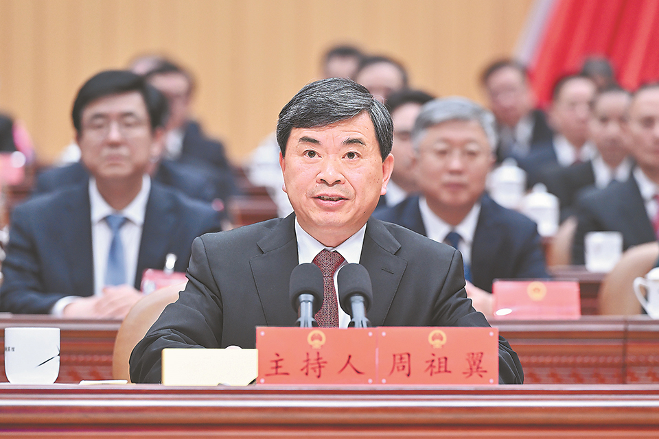 大会主席团常务主席、执行主席周祖翼主持会议并讲话。周祖翼强调,全省上下要更加紧密地团结在以习近平同志为核心的党中央周围,深入贯彻落实习近平总书记重要讲话重要指示批示精神,扭住目标不放松,一张蓝图绘到底,锐意进取、善作善成,为在中国式现代化建设中奋勇争先作出新的更大贡献。