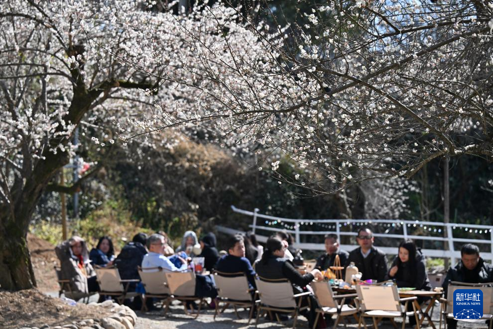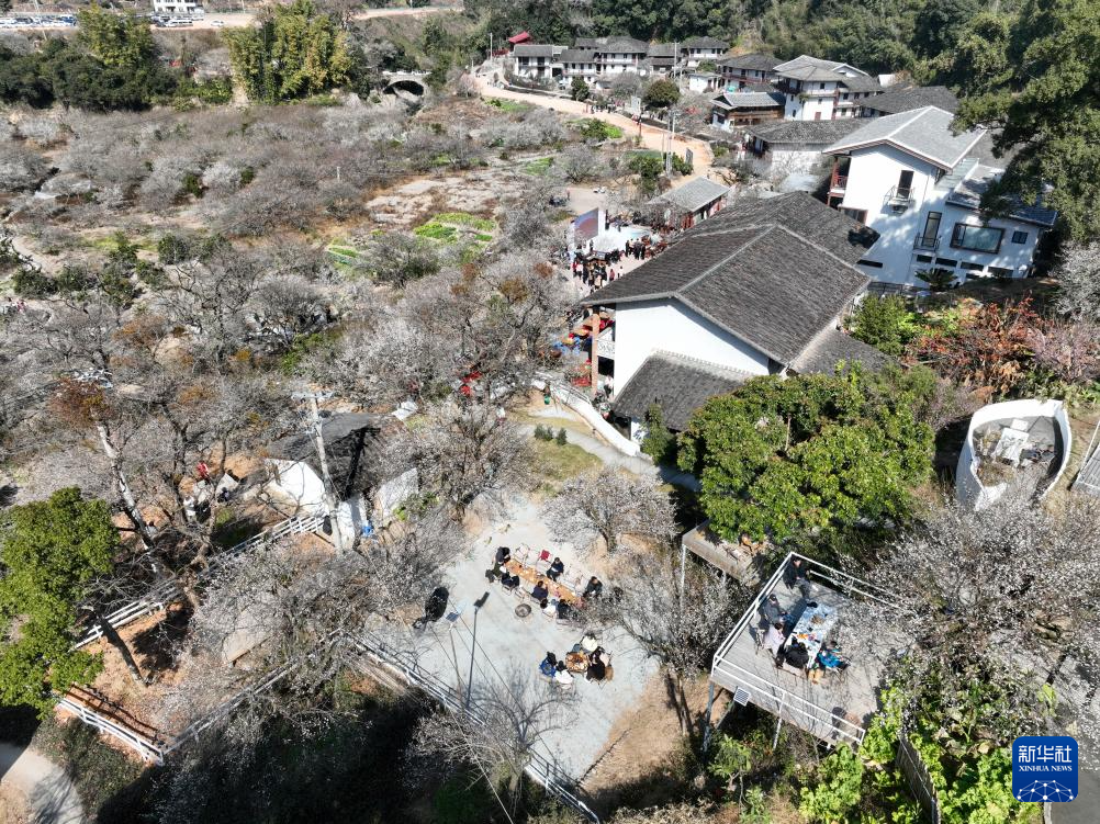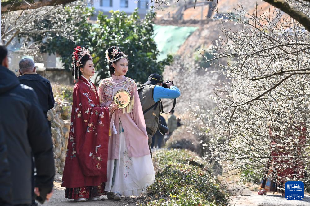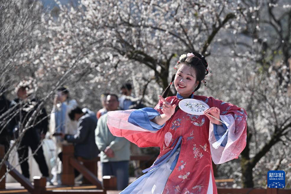 福建省福州市永泰县正值青梅开花时节,当日,以“花前乐下 此时最美”为主题的国风雅集冬日赏梅季在该县葛岭镇文埕湾梅林正式启动,活动现场举行音乐演唱、古装巡游等活动,吸引游客前来参观游玩。