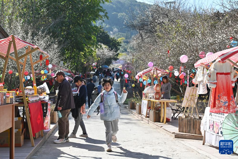 1月17日,游客在永泰县文埕湾梅林举行的冬日赏梅活动上选购商品。新华社记者 姜克红 摄