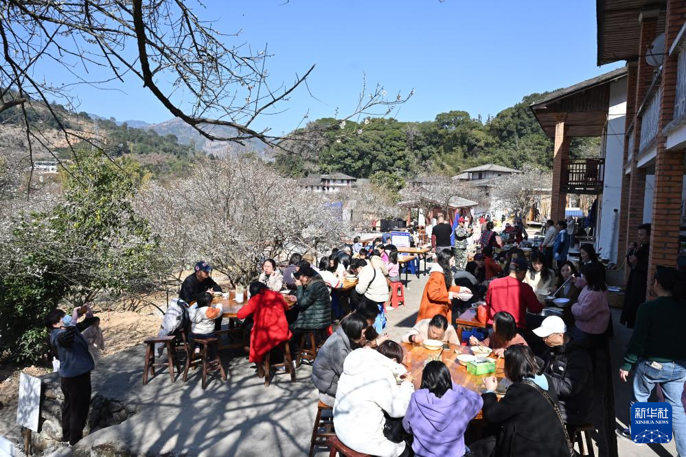1月17日,游客在永泰县文埕湾梅林旁的农家乐里就餐。