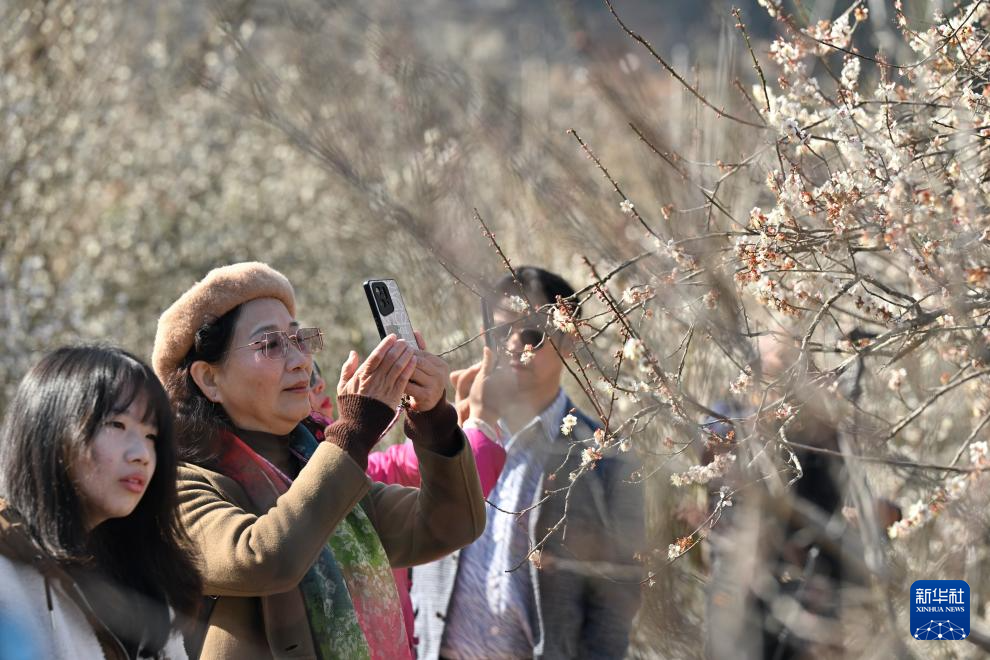 1月17日,游客在永泰县文埕湾梅林拍摄梅花。新华社记者 姜克红 摄