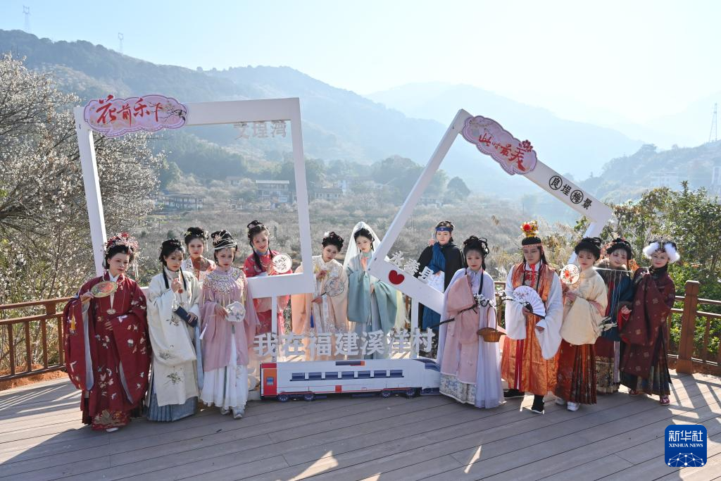 1月17日,在永泰县文埕湾梅林举行的冬日赏梅活动上,参加古装巡游的表演者合影。新华社记者 姜克红 摄