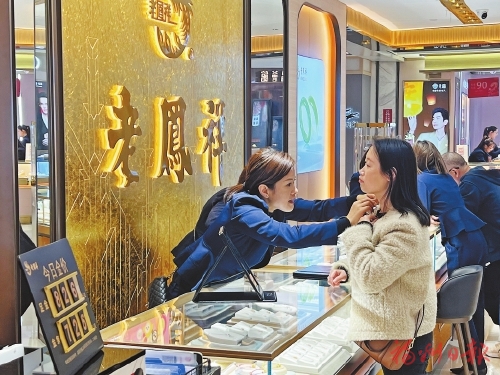 在黄金市场,各大金店也相继推出“卷卷蛇”“百灵蛇”“如意蛇”等以生肖蛇为主题的金饰。“这款S形蛇饰品寓意财富缠绕,蛇来运转。”“这是我们店的爆款灵蛇项链,上面镶嵌着珐琅彩,设计感十足!”在东百中心A馆的各家黄金店里,人头攒动,销售人员正在热情介绍金饰。