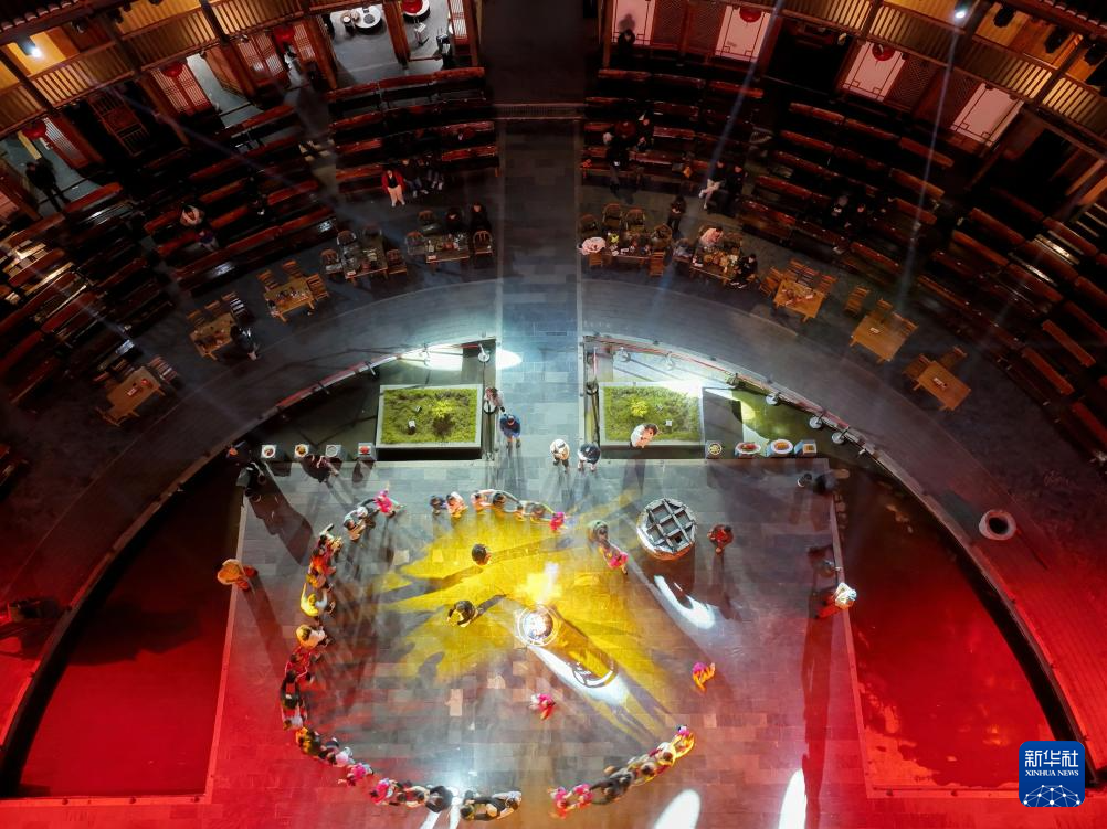1月19日,游客在福建省龙岩市永定区的土楼参加节目互动(无人机照片)。新华社记者 邢广利 摄