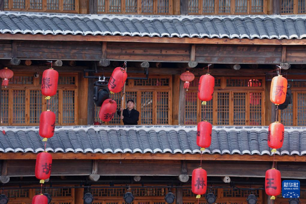 1月19日,工作人员在福建省龙岩市永定区的土楼悬挂红灯笼。新华社记者 邢广利 摄