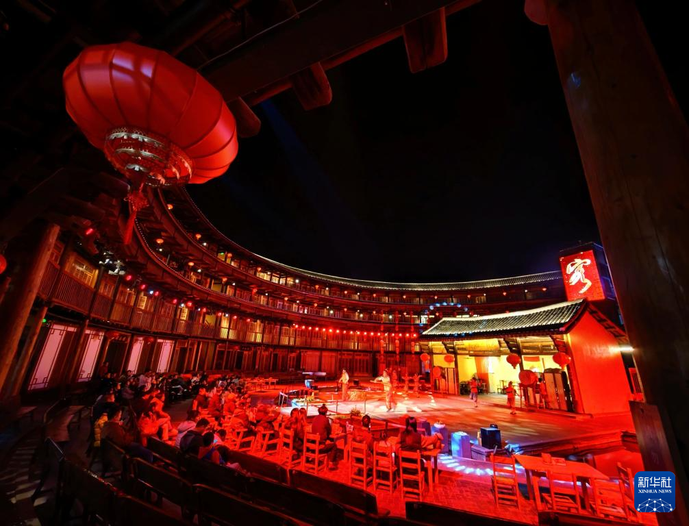 1月19日,游客在福建省龙岩市永定区的土楼观看演出。新华社记者 邢广利 摄