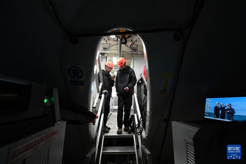 郑桂雄(左)和张宗昌在机舱内讨论风机故障处理方法。新华社记者 林善传 摄