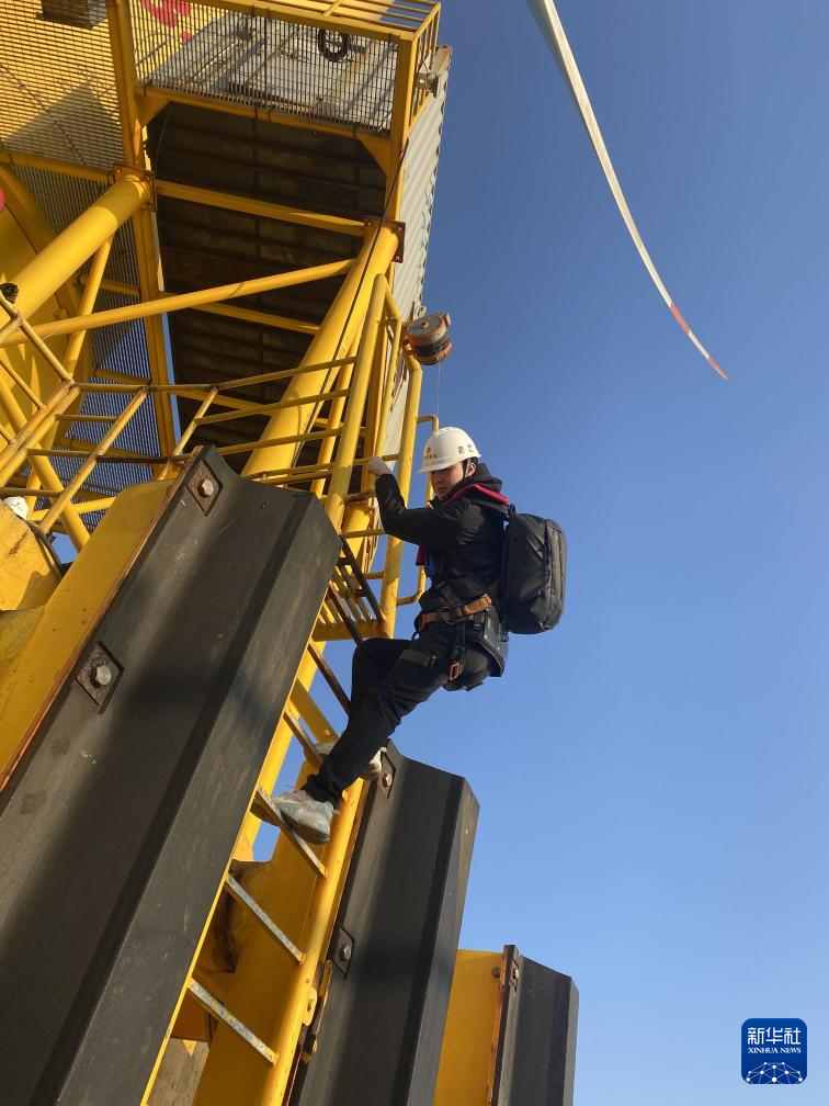 运维人员正在爬上风机。新华社记者 林善传 摄