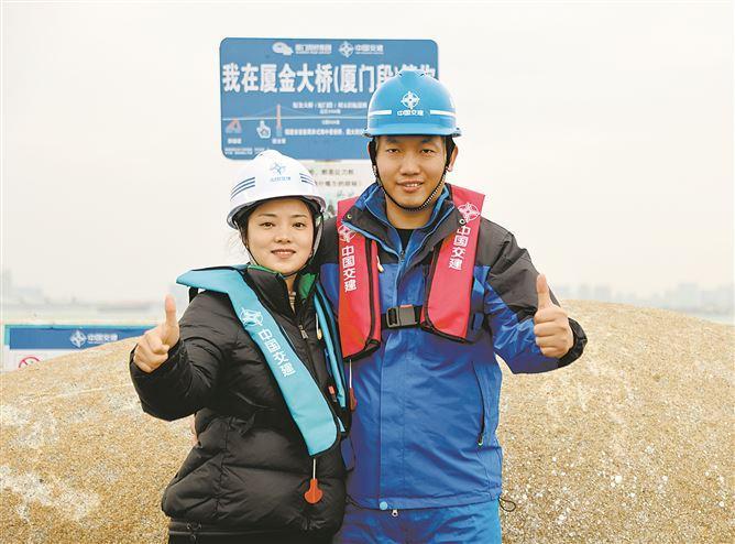 胡逐江夫妇在厦金大桥(厦门段)建设一线团聚过年。(记者 卢剑豪 摄)