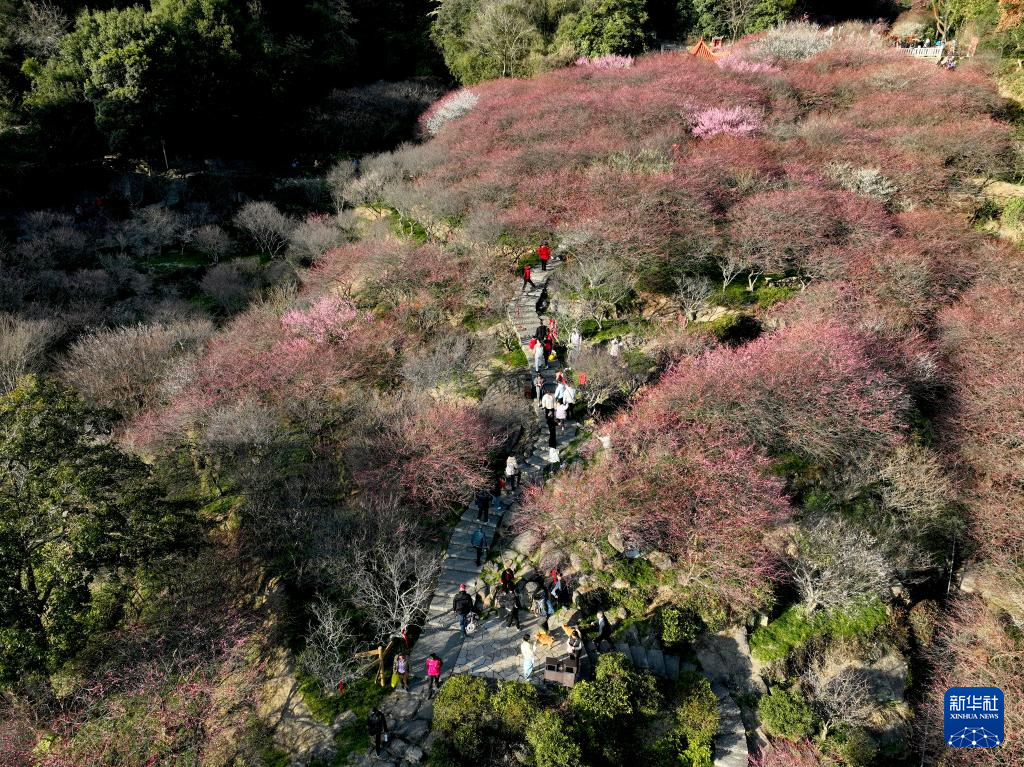 1月29日,游人在福州鼓山梅里景区赏梅(无人机照片)。新华社记者 姜克红 摄