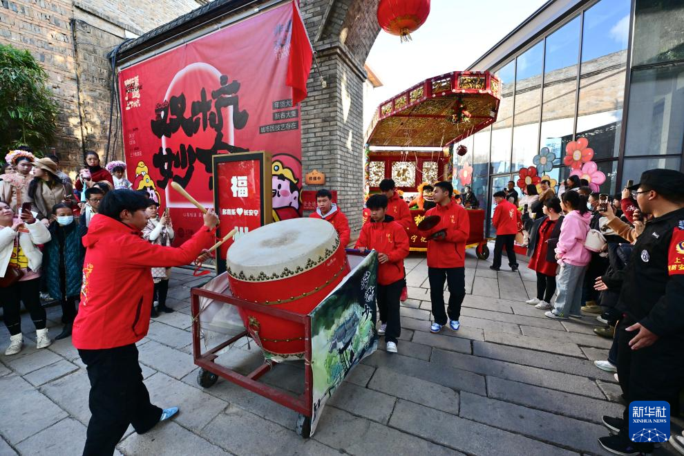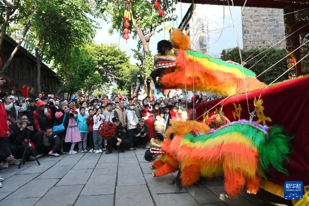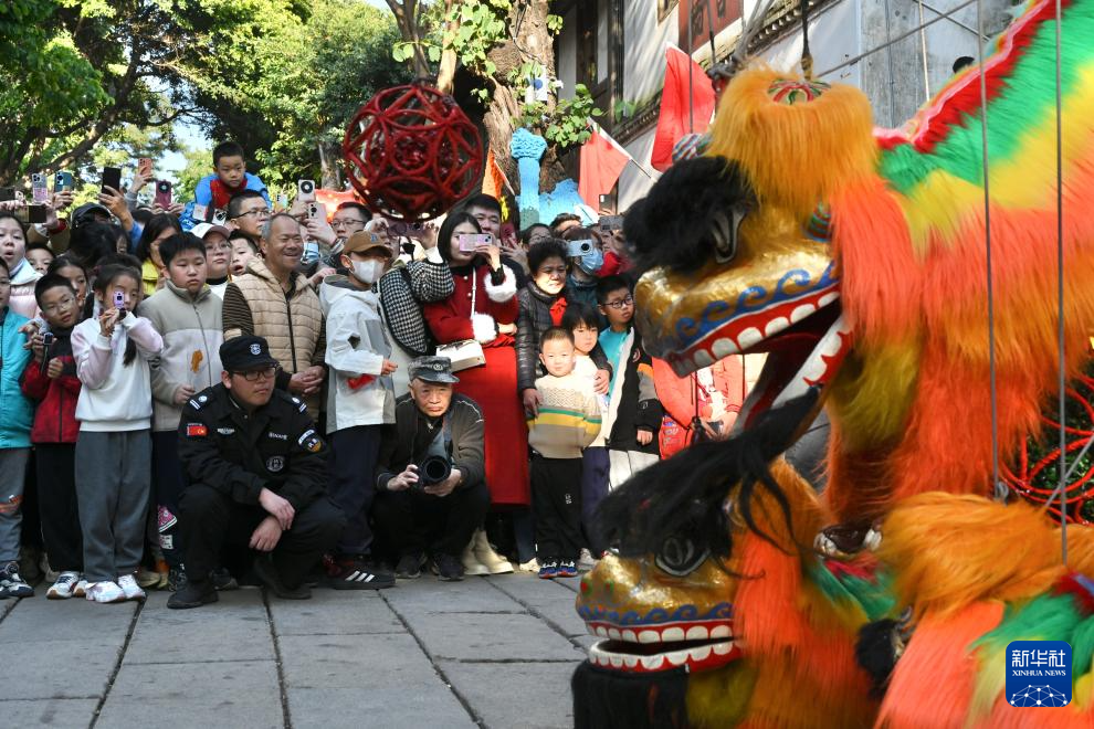 1月30日,人们在福州市上下杭历史文化街区观看兴贤少年线狮队的表演。新华社记者 姜克红 摄