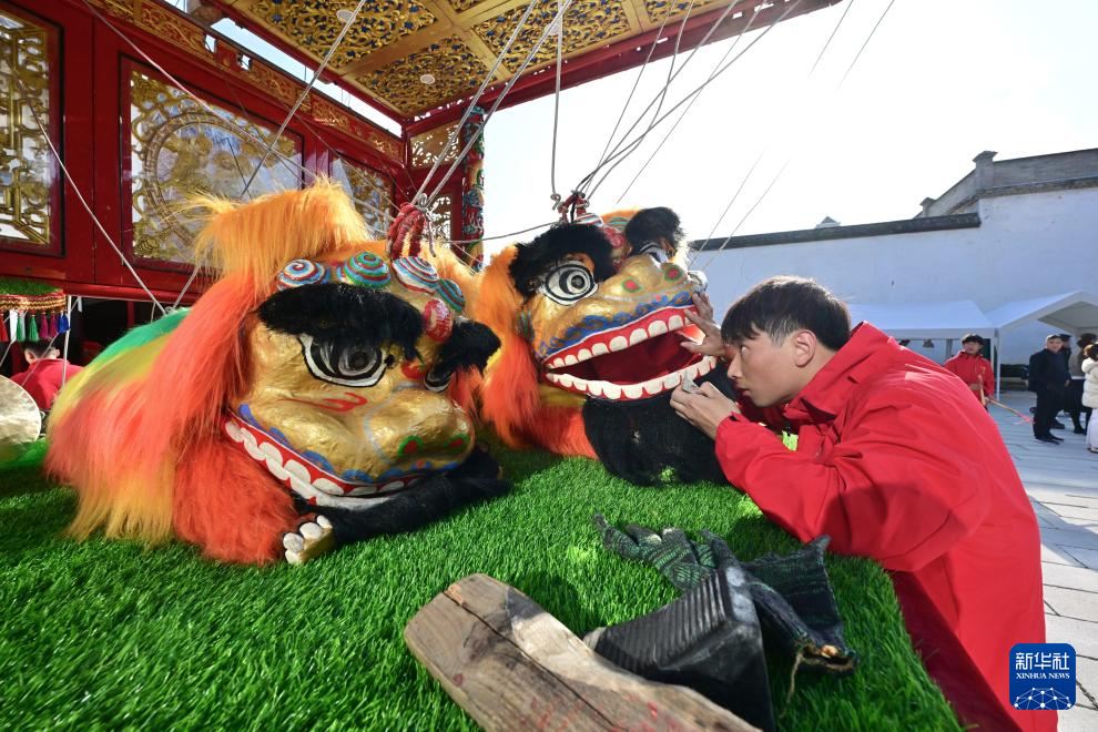 1月30日,在福州市上下杭历史文化街区,兴贤少年线狮队队长陈吉宏在演出前检查道具。新华社记者 姜克红 摄