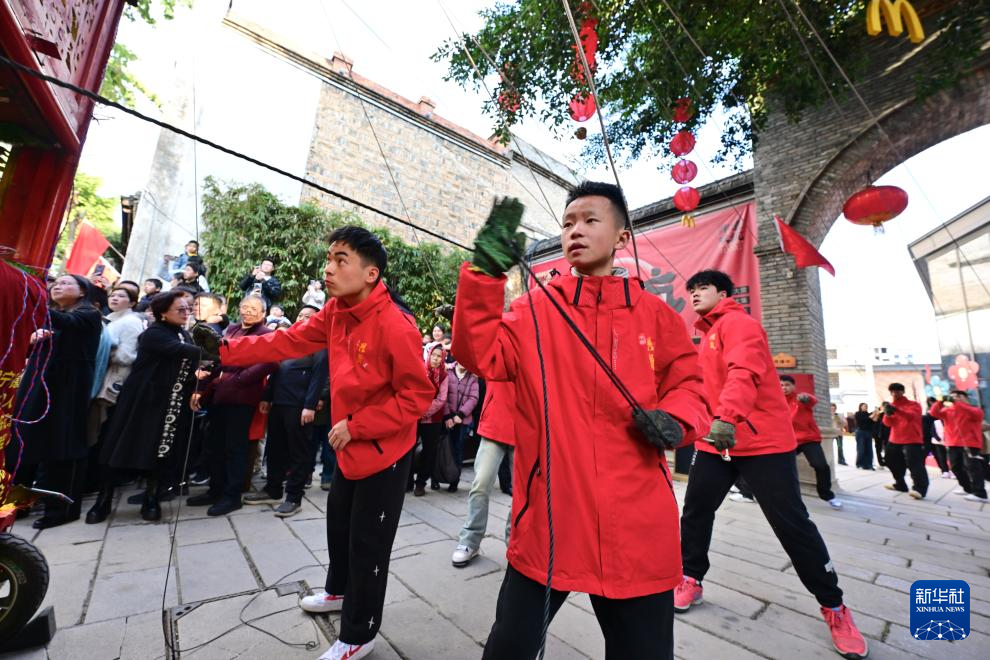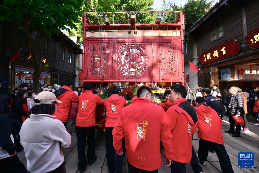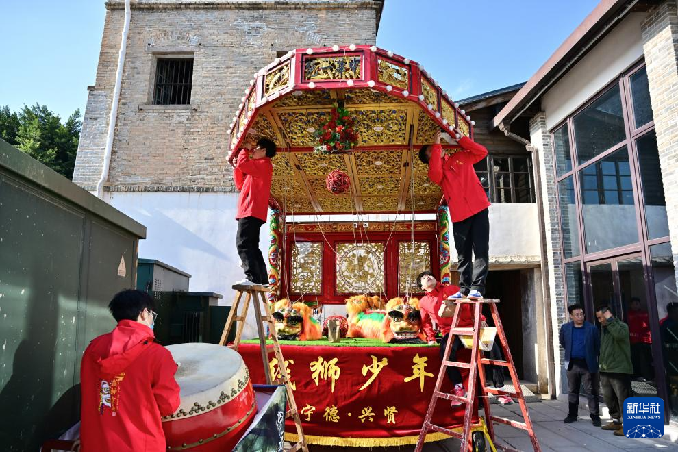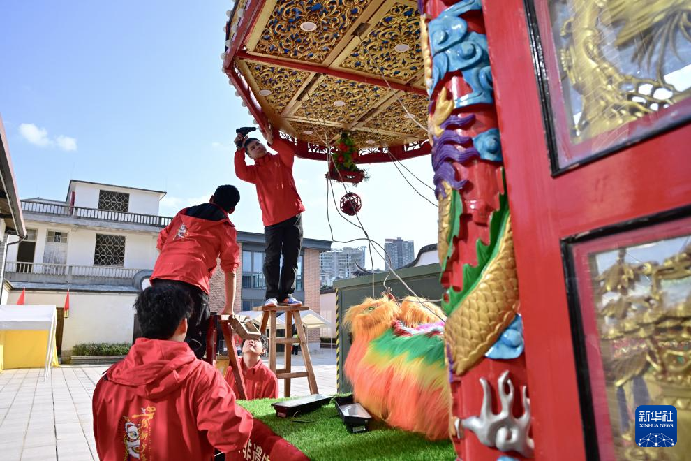 1月30日,在福州市上下杭历史文化街区,兴贤少年线狮队成员将道具转移至表演场地。新华社记者 姜克红 摄