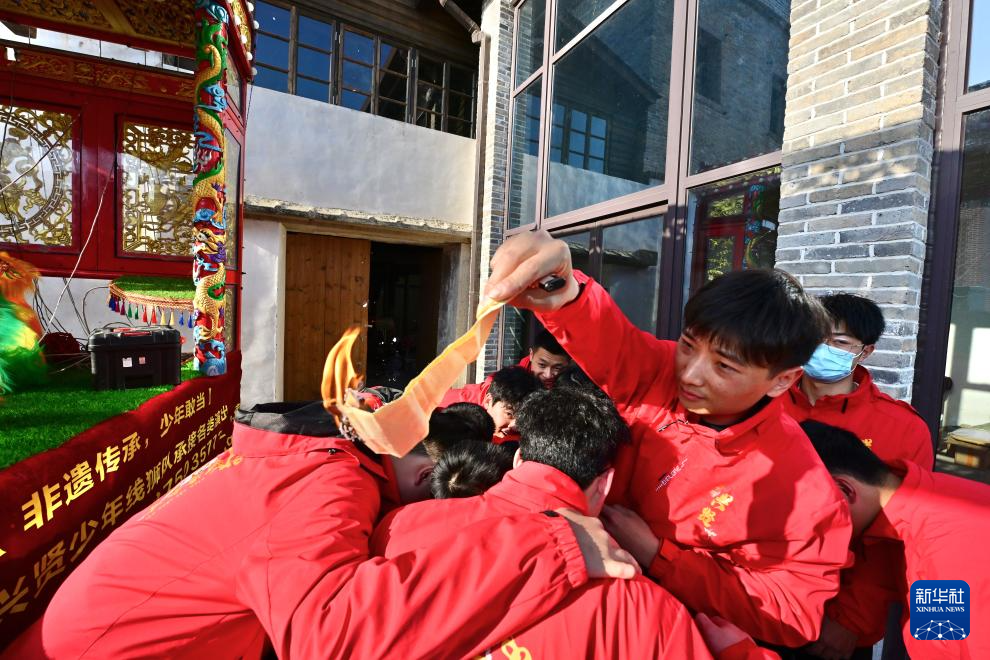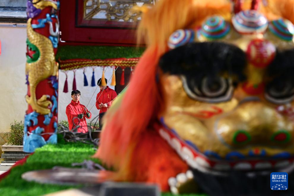 1月30日,在福州市上下杭历史文化街区,兴贤少年线狮队队长陈吉宏(左)在演出前准备。新华社记者 姜克红 摄